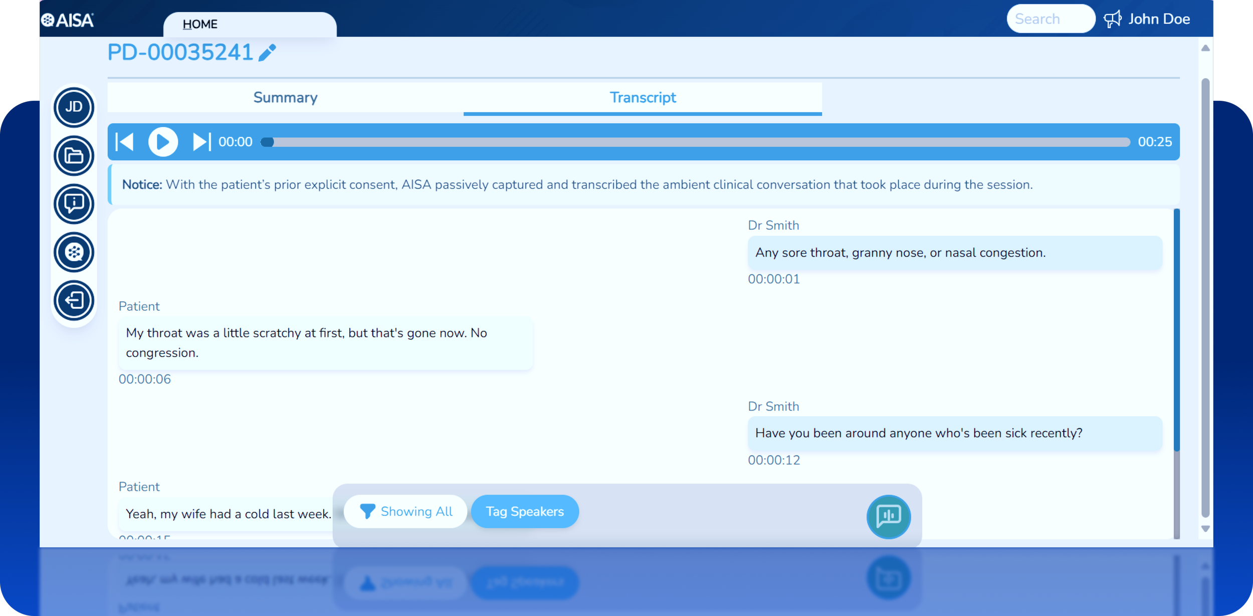Powered by Ambient and Generative AI, AISA® captures patient encounters, then automatically generates structured clinical notes/documentation with seamless integration and distribution.